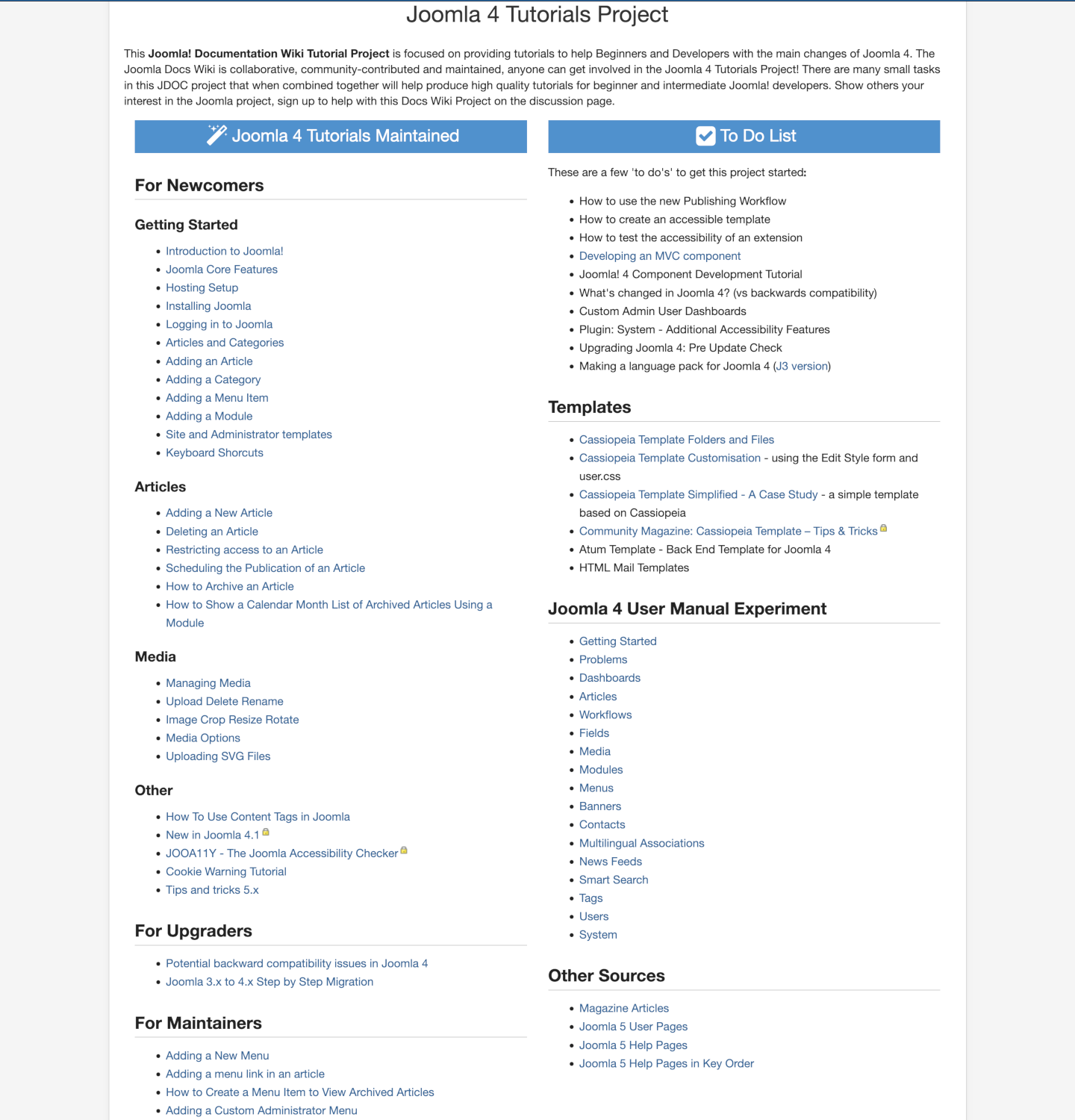I began contributing to Joomla! documentation in 2020 when I revised all of the Help screens for Joomla 4 (and later 5). In the process I became very familiar with the MediaWiki installation that powers docs.joomla.org. This is the Home page: