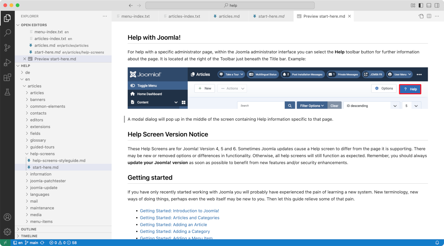 Joomla! Help screens follow a common pattern described in the Documenter articles. They use a lot of chunks, some from Joomla 3 documentation, and many links to here, there and everywhere. This is difficult to maintain and translate! I decided the Help pages needed to be simplified for delivery on another platform. So I made sections such Toolbar and List descriptions into Common Elements so that individual Help pages could focus on the important page elements.